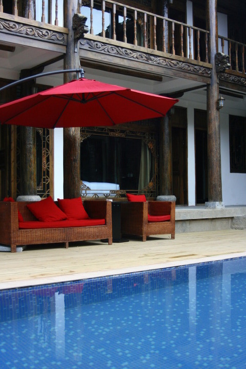 디럭스 객실의 맞은 편 창으로는 객잔의 수영장을 보실 수 있습니다.