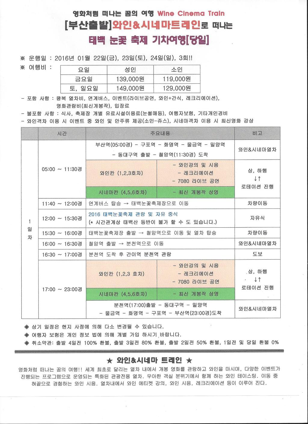 [당일] '16.1.22(금), 1.23(토), 1.24(일) 와인시네마 태백 눈꽃 기차여행 작성자김은경|작성시간15.12.16|조회수155 목록 댓글 0 글자크기 작게가 글자크기 크게가 부전역 여행센터051-440-2599, 2611 다음검색 현재 게시글 추가 기능 열기 북마크 공유하기 신고 센터로 신고 댓글 댓글 0 댓글쓰기 답글쓰기 댓글 리스트