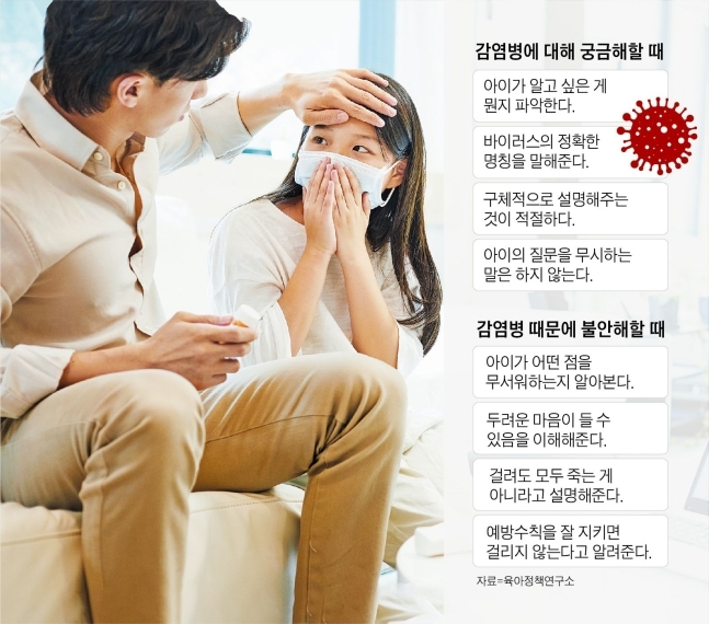 먼저 아이가 감염병에 대해 어떤 걸 알고 있고, 왜 궁금한지 꼼꼼히 물어본다. 추상적인 용어보다는 쉽고 구체적인 표현을 사용하는데, 예를 들면 “나쁜 균이 우리 몸에 들어오면 열이 나고 기침이 나” “감기에 걸렸던 적 있지? 그것과 비슷해”같이 설명하는 것이 좋다.