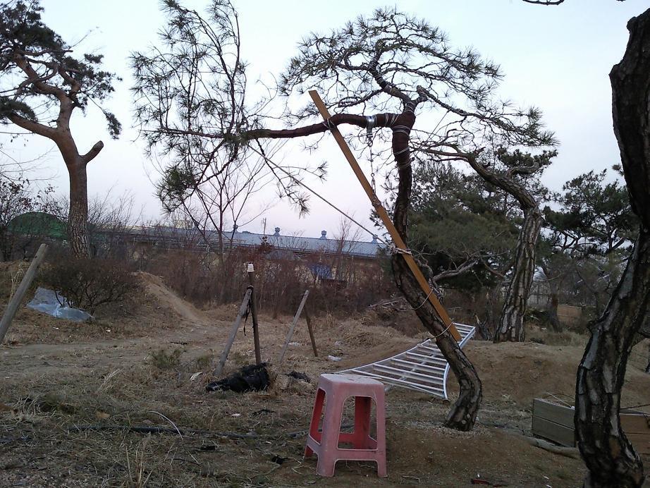각을 많이 좁혔다. 옮겨지지 않을 나무라면 고정 부목을 박고 쉽게 하겠지만... 옮겨질껏 같아서 이동까지 생각을 한후...