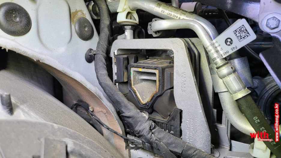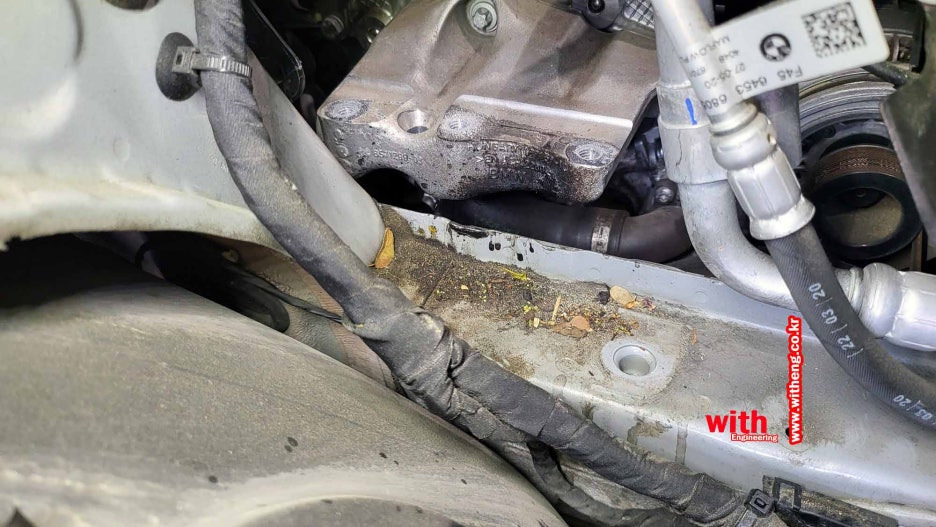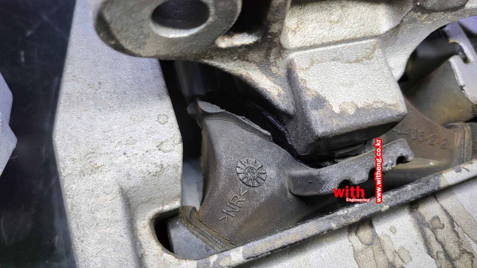 파손된 엔진 마운트가 보입니다. 검은색이 흘러내렸죠
