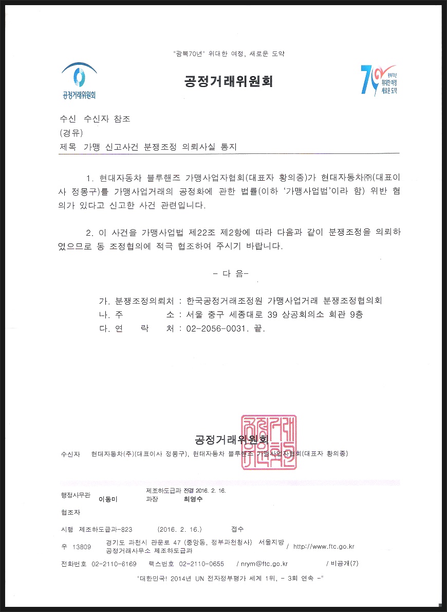 분쟁조정을 의뢰하여 블루핸즈가맹점 사업자단체와 현대자동차와의 당사자간