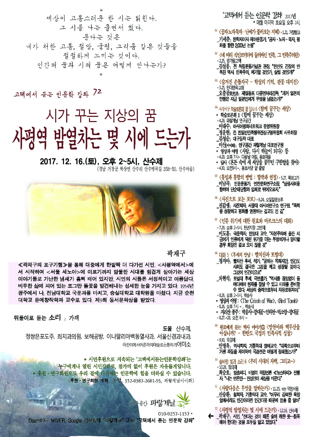 지난달 신승환 선생을 통해 사람다움을 반추한 데 이어, 오는 12월 16일(토) 낮2시 산수제(경남 거창군 북상면 산수리 산수병곡길 358-50. 산수마을 표정숙가옥)에서 곽재구 시인의 <시가 꾸는 지상의 꿈 - 사평역 밤열차는 몇 시에 드는가>를 주제로, 일흔두 번째 고택에서듣는인문학강좌를 마련한다.