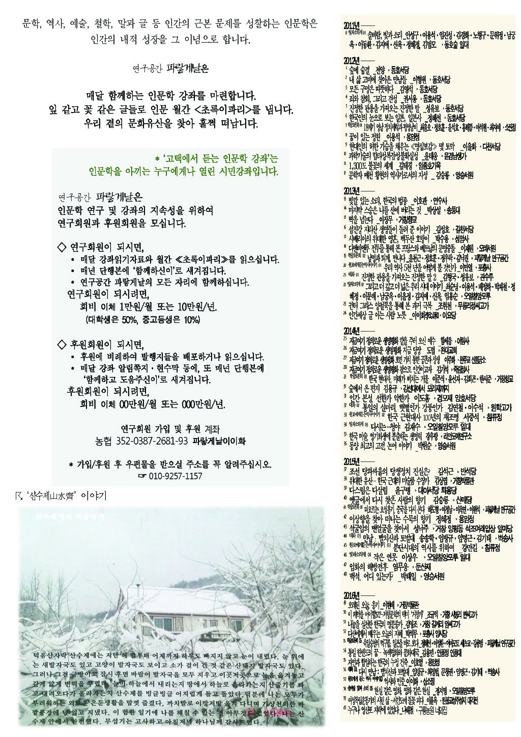 시민후원으로 지속되는 연구공간 파랗게날의 인문학 강좌는 누구에게나 열린 시민강좌로 참가비 없이 후원은 자유롭게이다. 연구/후원회원 가입으로 우리 곁에 다가서는 인문학에 힘을 더할 수 있다. 회원은 강좌․유람 등 파랗게날의 모든 행사에 함께하며, 매달 인문월간 ≪초록이파리≫와 강좌자료집을 읽게 된다. (문의는 010-9257-1157_이이화. Daum이나 NAVER, Google 검색창에 ‘파랗게날’ 또는 ‘고택에서듣는인문학강좌’)