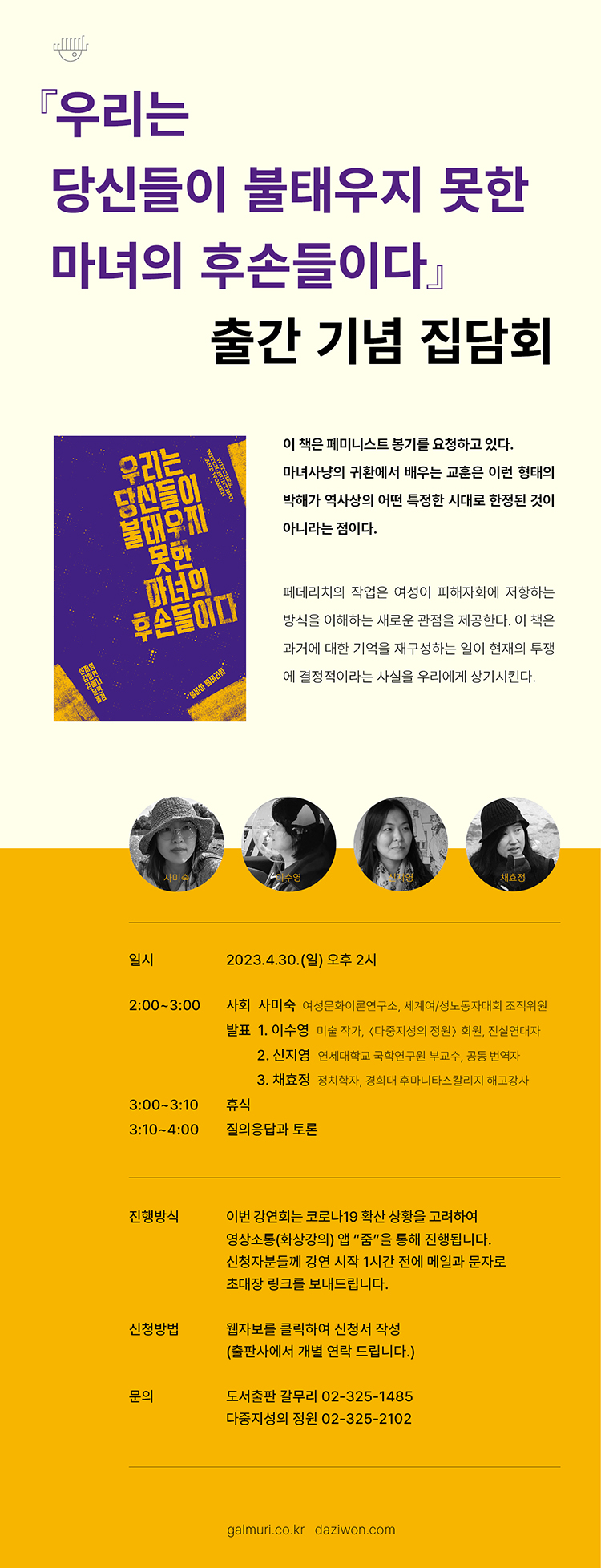 초대! 『우리는 당신들이 불태우지 못한 마녀의 후손들이다』 출간 기념 집담회 (2023년 4월 30일 일 오후 2시) 작성자도서출판갈무리|작성시간23.04.29|조회수9 목록 댓글 0 글자크기 작게가 글자크기 크게가 · 집담회 자세히 보기 https://bit.ly/3ULQgdH· 집담회 신청하기 https://bit.ly/wemahoo 다음검색 현재 게시글 추가 기능 열기 북마크 신고 센터로 신고 댓글 댓글 0 댓글쓰기 답글쓰기 댓글 리스트