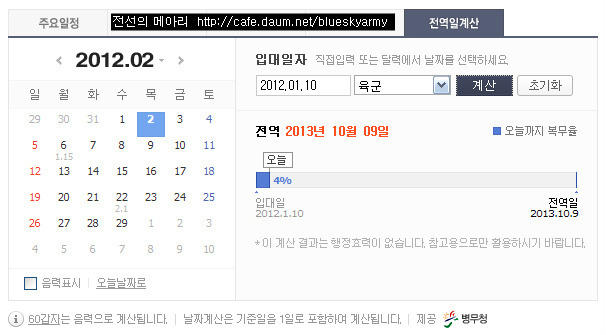 입대일자, 군별을 해당사항에 맞추어 입력한 후 계산 버튼을 클릭하면