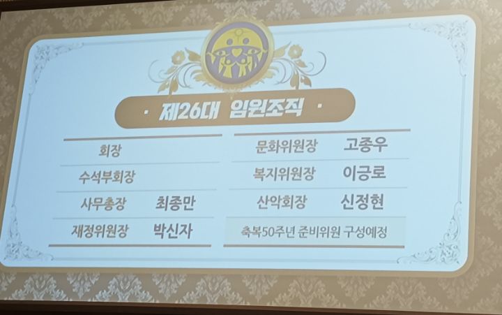 김명렬수석부회장이 26대회장을 맡아 수고 하기로 결정되었으며,감사는 양형모,신재삼