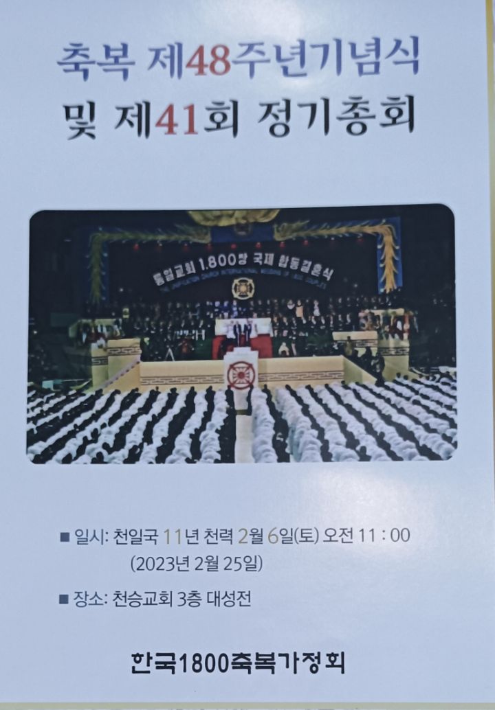 에서,한국 1800가정 축복 제48주년기념식및 제 41회 정기총회가 개최되었다.