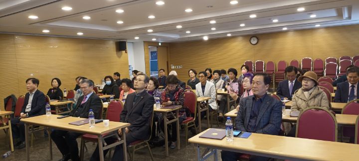 신임 김명렬회장은 인사와 더불어 중요업무지침을 발표하였는가 하면,행사 중간엔, 고종우낭송가의 시낭송 한편을 들어보는 감동적인 시간을 갖기도 하였다.
