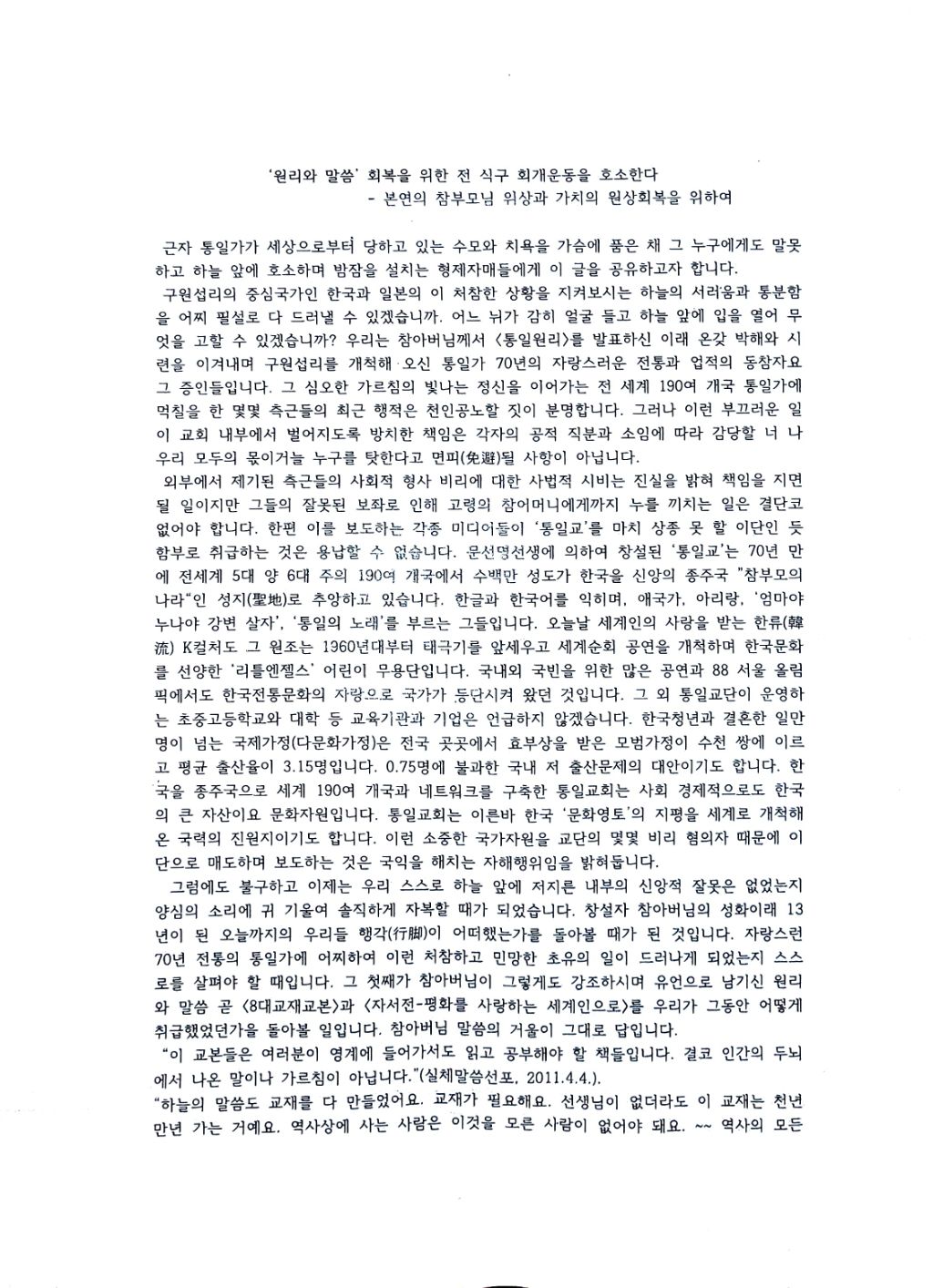 하나, 지금 직면하고 있는 통일가의 절망적인 총체적 위기사태를 극복할 희망은 문선명 참아버님의 <원리와 말씀>의 가르침과 그 전통을 올바르게 이어받아 실천하는데 있음을 확인하고 이를 실행할 것을 결의한다.