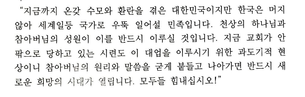 하나, 그리하여 세계통일가가 금번 9·23 사태를 계기로 대오각성 회개하며 우리 신앙의 근본인 참아버님의 <원리와 말씀>을 중심에 모시고 하나님의 구원섭리사의 완성인 전인류 공생(共生) 공영(共榮) 공의(共義)의 천일국 이상세계를 향하여 중단없는 희망찬 전진을 계속할 것을 엄숙히 결의한다.
