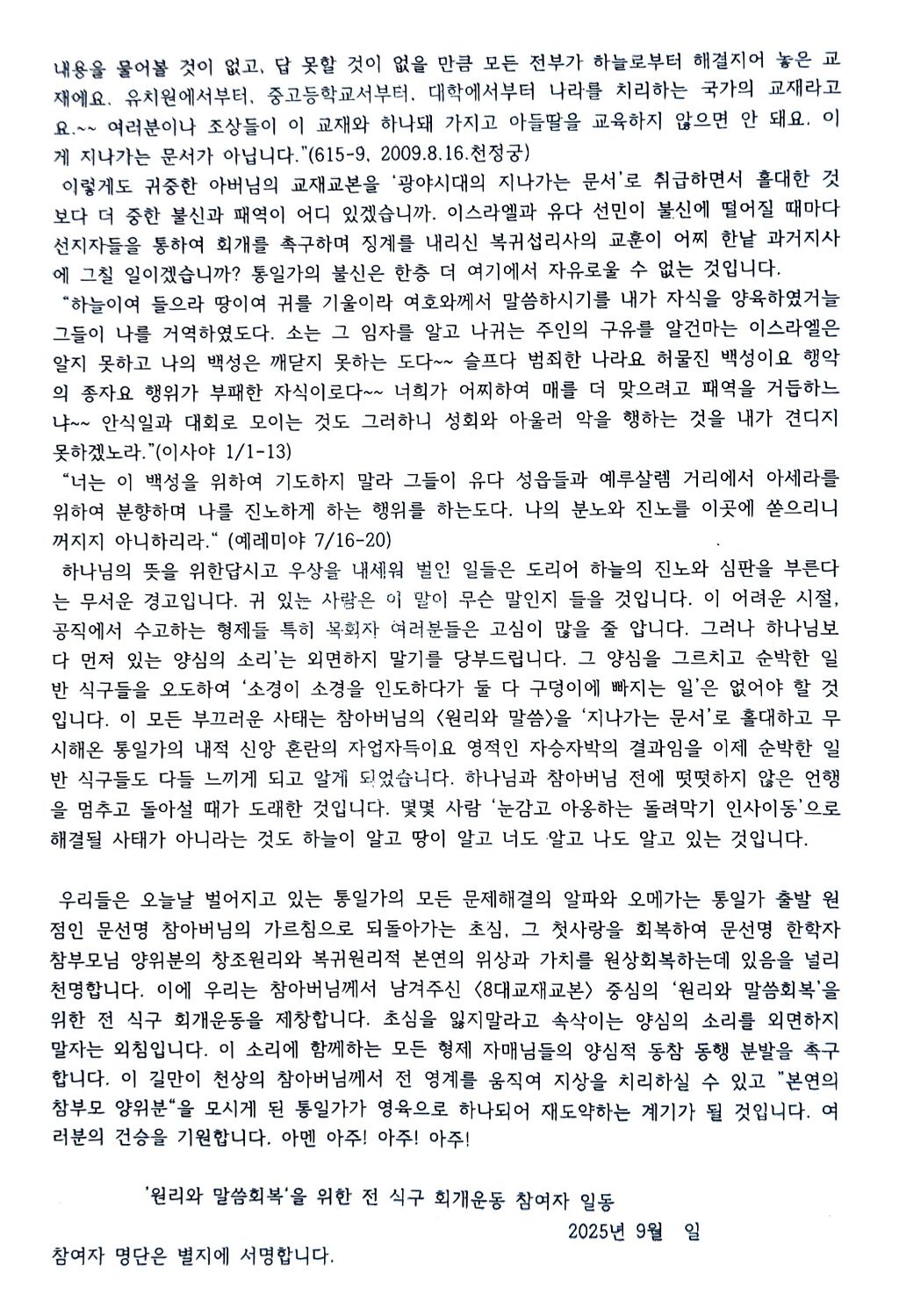 ‘원리와 말씀’ 회복을 위한 전 식구 회개운동 참여자 일동