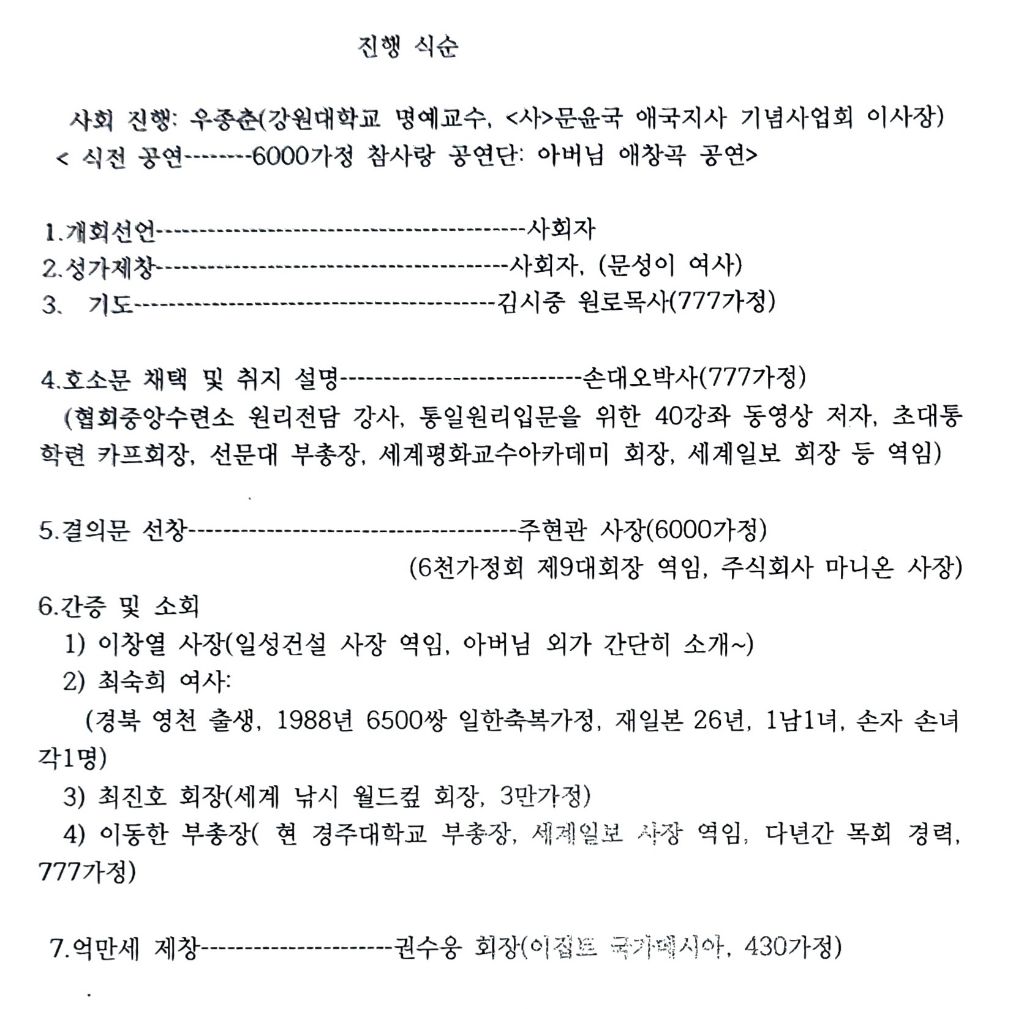 말씀이 끝난후에는,결의문 채택(주현관 사장),간증 및 소회(이창열 사장,최숙희 여사, 최준호 회장,이동한 부총장)의 시간으로 이어졌고, 억만세 삼창(권수용회장)을 끝으로 행사를 마무리 했다.