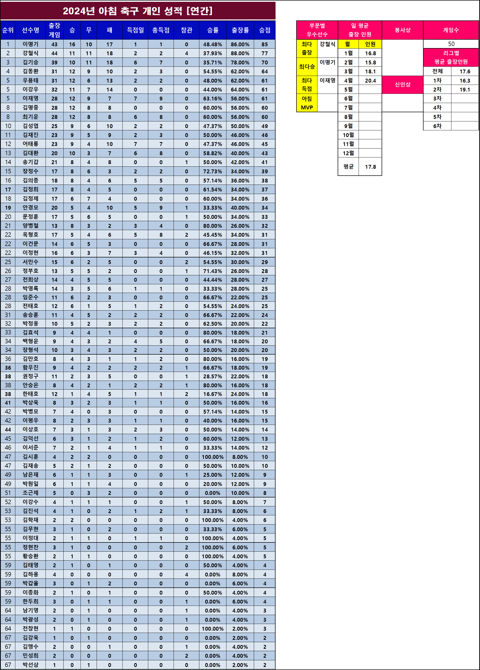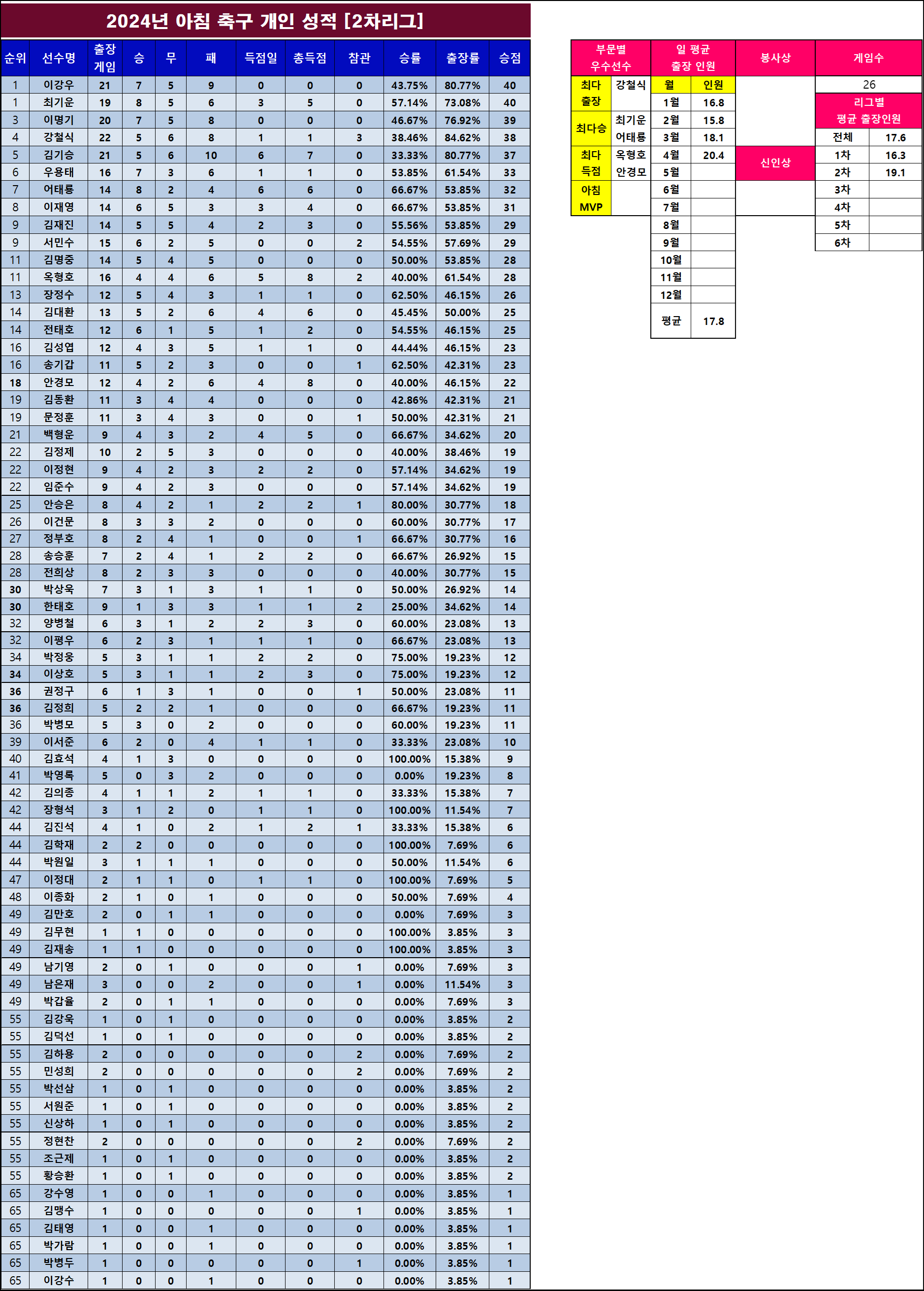 2024년 2차리그 및 연간 개인기록(4/30 최종) 작성자이강우|작성시간24.04.28|조회수70 목록 댓글 0 글자크기 작게가 글자크기 크게가 다음검색 현재 게시글 추가 기능 열기 북마크 공유하기 신고 센터로 신고 댓글 댓글 0 댓글쓰기 답글쓰기 댓글 리스트