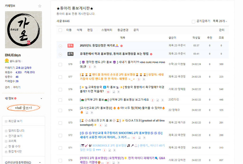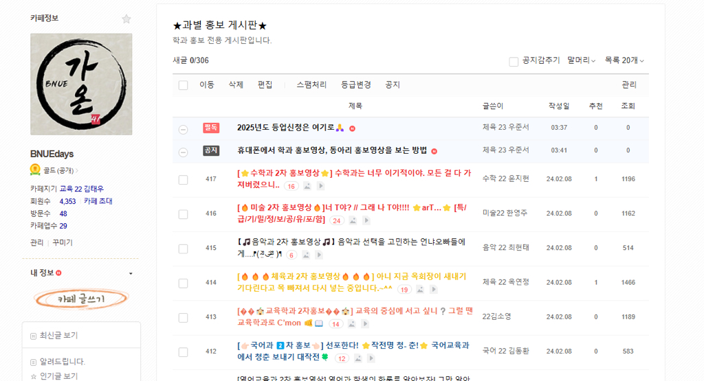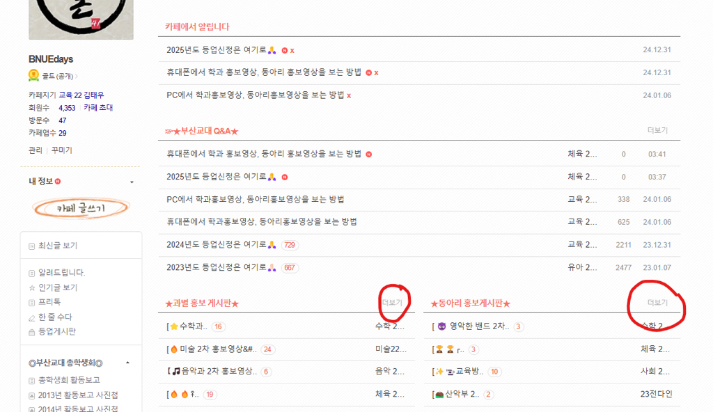 PC에서 학과 홍보영상, 동아리 홍보영상을 보는 방법 작성자체육 23 우준서|작성시간24.12.31|조회수466 목록 댓글 0 글자크기 작게가 글자크기 크게가 1. 과별 홍보 게시판이나 동아리 홍보 게시판 옆의 '더보기'를 클릭합니다!2. 게시글을 클릭하고 영상을 시청합니다! 다음검색 현재 게시글 추가 기능 열기 북마크 신고 센터로 신고 댓글 댓글 0 댓글쓰기 답글쓰기 댓글 리스트