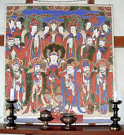 補陀山上琉璃界 보타산상유리계 보타산 위 유리세계에 머무시는 正法明王觀世音 정법명왕관세음 정법명왕이신 관세음보살님 影入三途利有情 영입삼도이유정 그 그림자 삼도에 들어가 유정(중생)을 이롭게 하며 形分六道曾無息 형분육도증무식 그 모습 육도에 나누어 일찍이 쉼이 없으시네.
