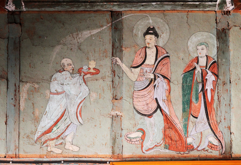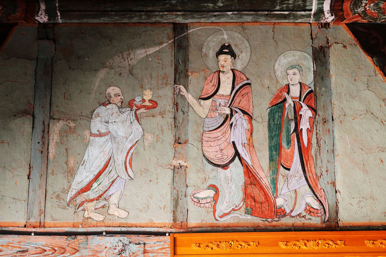 약사전의 벽화-부처님께 차를 공양하는 그림