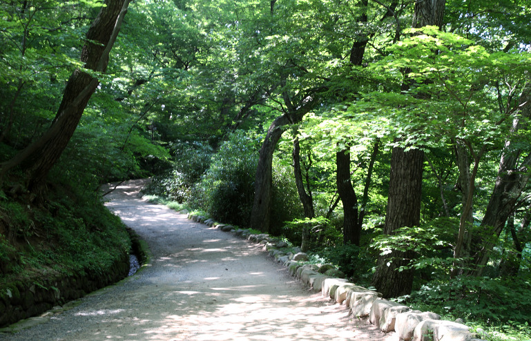 일주문에서 기림사로 가는 숲길, 흙길을 약 5분 걸으면 기림사이다