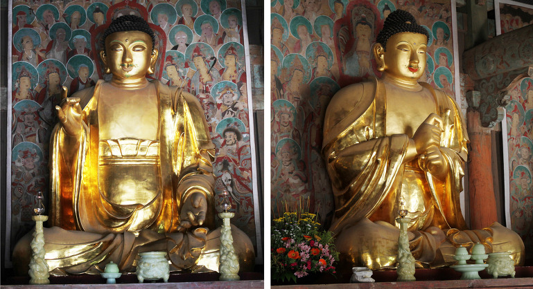 대적광전 안에는 가운데 비로자나불, 왼쪽에 노사나불, 오른쪽에 석가모니불을 모셔 삼신불(三身佛)을 이루는데, 흙으로 빚은 이 세 불상은 손의 위치와 자세만 다를 뿐 표정과 모양이 거의 같고 옷 주름까지도 비슷하다.