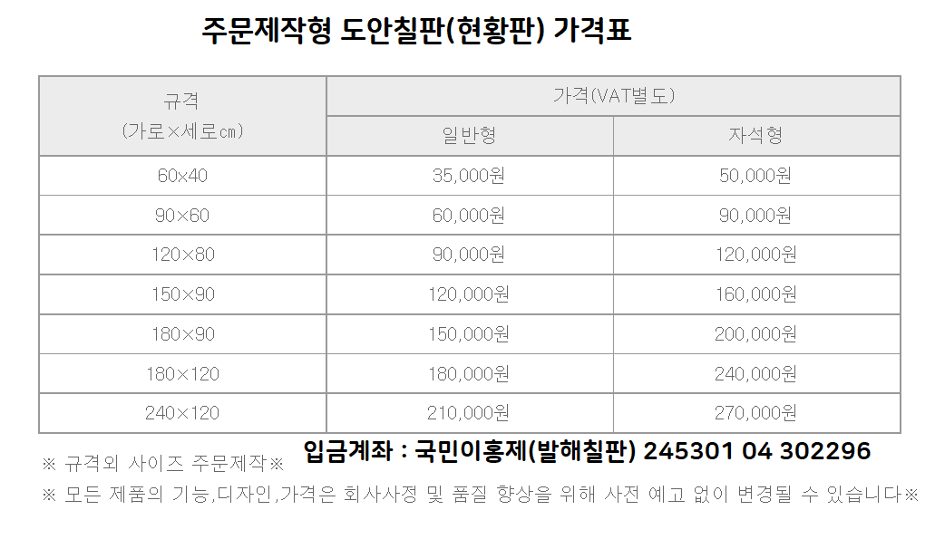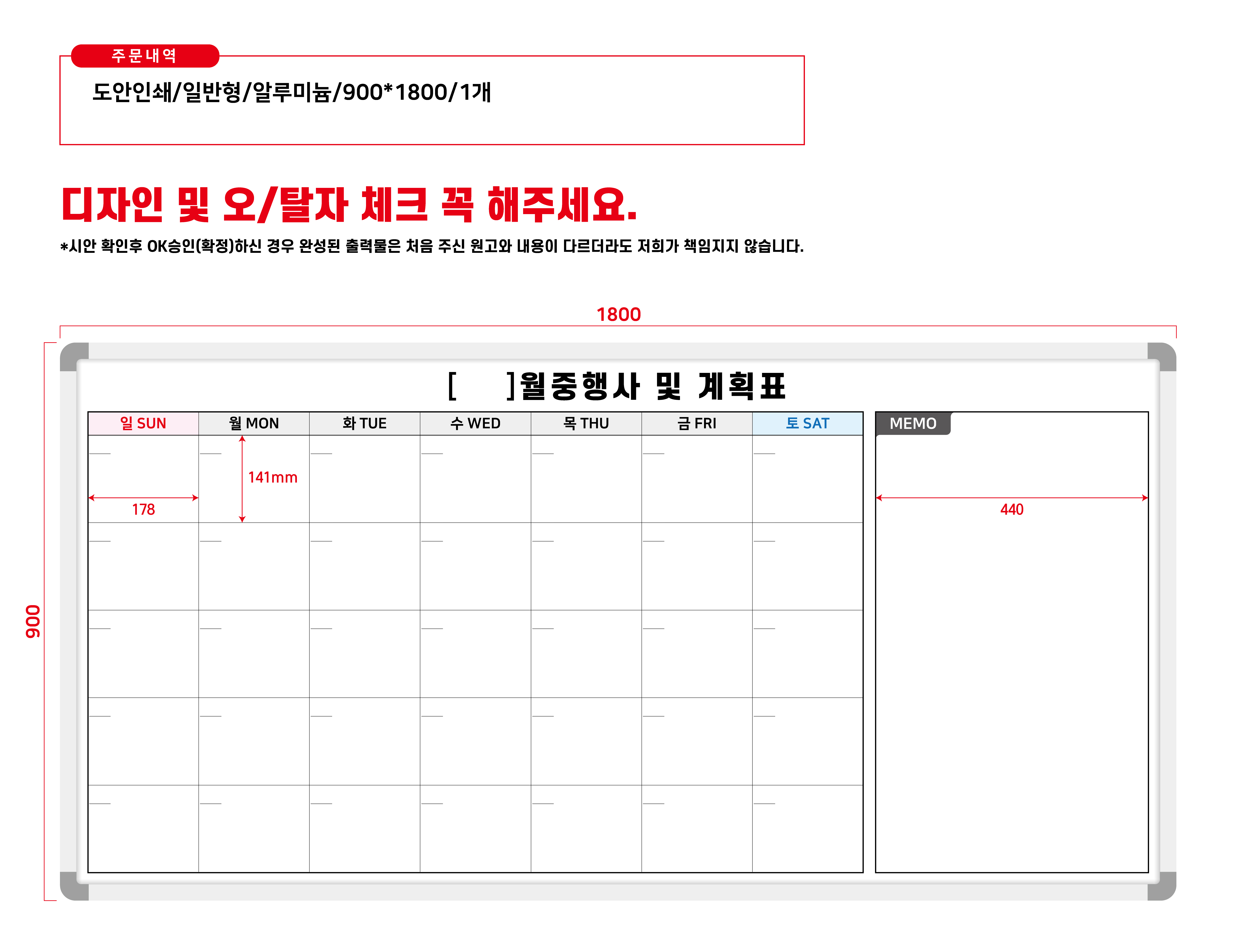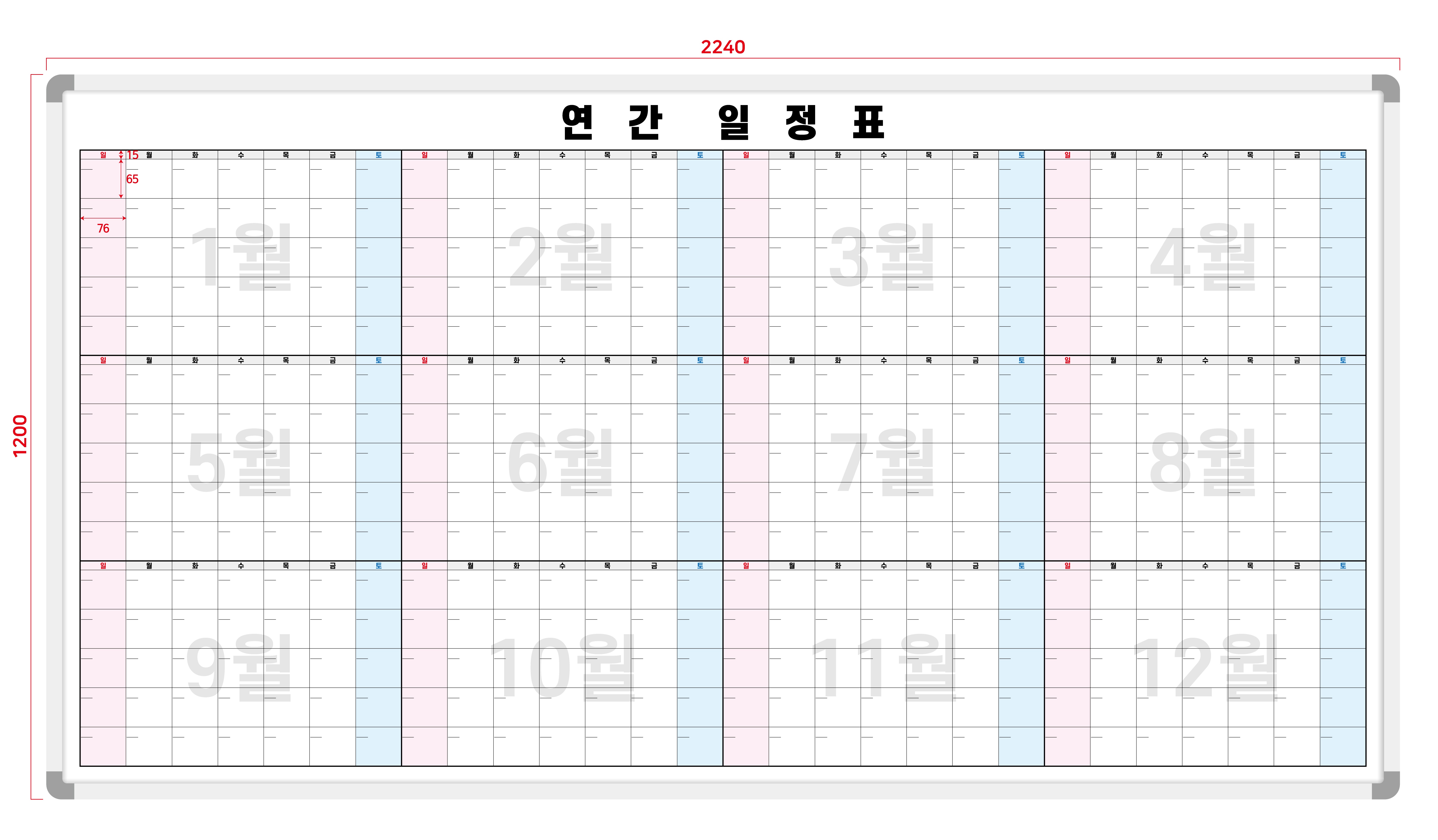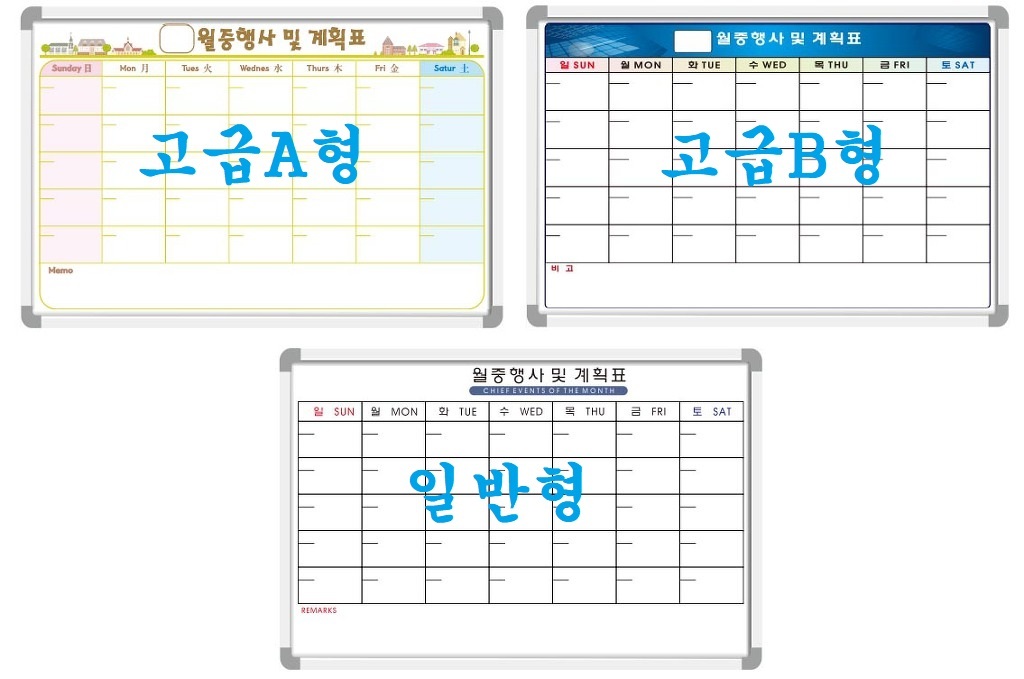 | 《고급형》연간일정표 제작문의 : 발해칠판 ☎ 010 3794 7825 031 674 1591 (24시간 문의 가능) 파일전송 bod78@hanmail.net 공장홈피 http://www.balhaeboard.co.kr/product/board02.htm SIZE 600*400 900*600 1200*800 1500*900 1800*900 1800*1200 2000*1200 2400*12000 ▣입금계좌 : 국민이홍제(발해칠판) 245301 04 302296 |