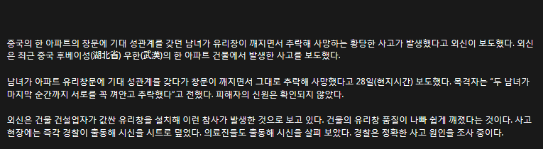 창문에 기대 성관계 갖던 남녀 껴안은 체 추락해 사망 작성자冣山(취산)|작성시간19.10.18|조회수52 목록 댓글 1 글자크기 작게가 글자크기 크게가 이슈♡화제 창문에 기대 성관계 갖던 남녀…껴안은 채 추락해 사망 다음검색 현재 게시글 추가 기능 열기 북마크 신고 센터로 신고 댓글 댓글 1 댓글쓰기 답글쓰기 댓글 리스트 작성자아름다운연인 | 작성시간 19.11.12 너무 안쓰럽네요 댓글 전체보기