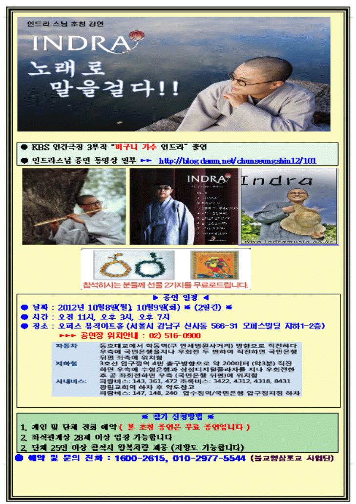 비구니가수 인드라스님 초청 무료공연으로 초대합니다. 작성자연꽃사랑|작성시간12.09.19|조회수12 목록 댓글 0 글자크기 작게가 글자크기 크게가 다음검색 현재 게시글 추가 기능 열기 북마크 공유하기 신고 센터로 신고 댓글 댓글 0 댓글쓰기 답글쓰기 댓글 리스트