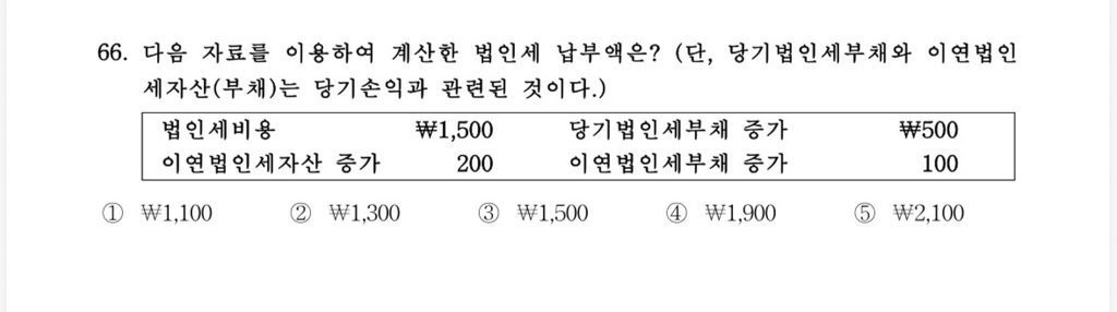 답댓글 작성자보수공사 작성시간 26.04.09 Kkww 문제에서 법인세비용이라고 주어지면 이미 법인세효과를 반영하고 나온 금액이라 그대로 쓰면 됩니다. 그래서 추가로 법인세비용을 잡아줄 필요없이 차변,대변에 비용, 자산,부채 증감만 적어주고 대차차이를 구하면 바로 납부한 법인세가 나옵니다.