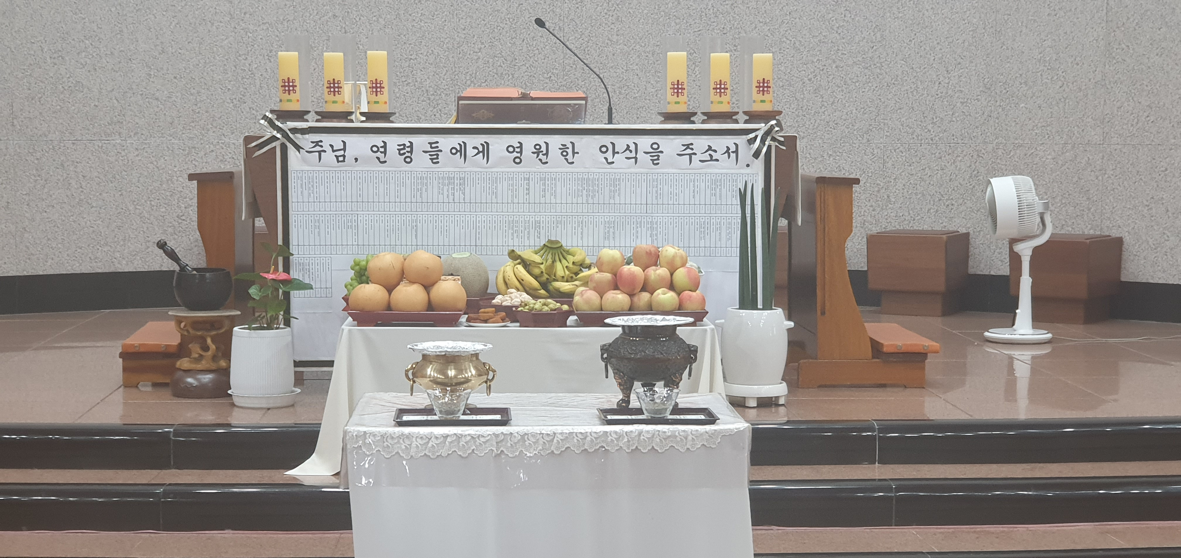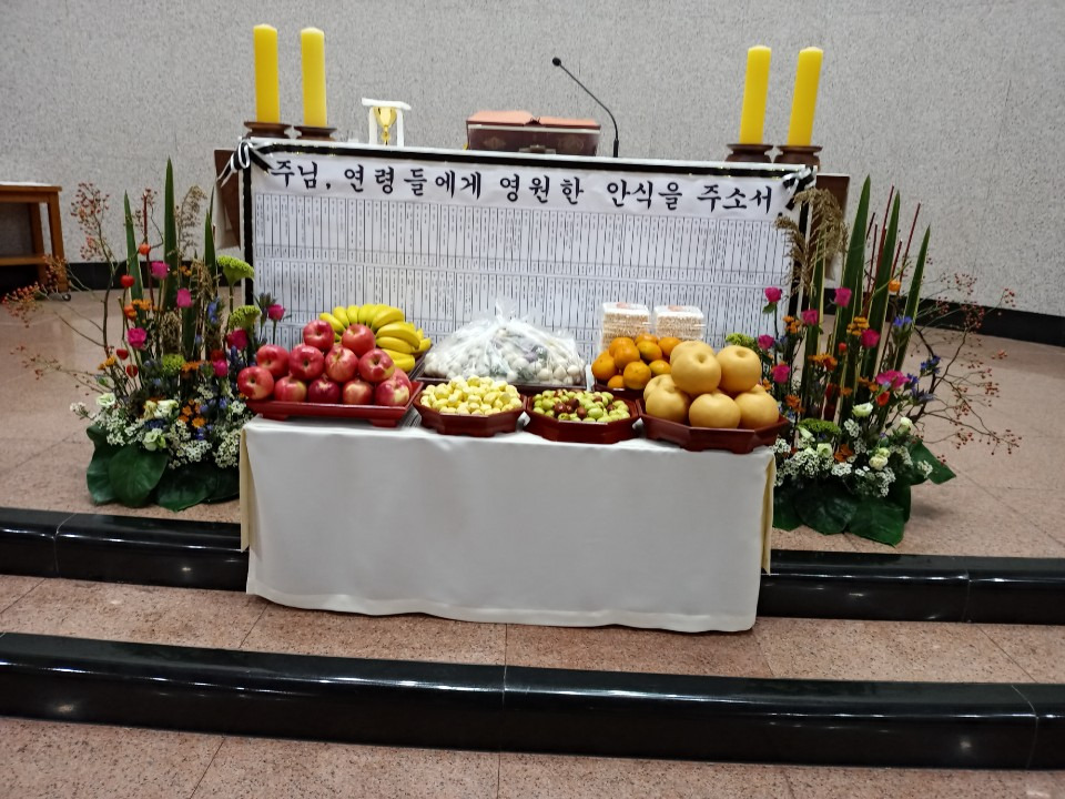 우리에게 비옥한 땅을 맡겨 주시고, 땅을 가꾸어 인간 생존의 양식을 마련하게 하신 천주여, 금년에도 제때에 비와 햇볕을 고루 내려 주시어 풍부한 곡식을 거두게 하셨으니, 햇곡식으로 우리 가족들이 음식을 마련하여 함께 나누며, 먼저 가신 조상들과 부모님들을 기억하오니, 그들에게는 천상 행복을 풍부히 허락하시고, 우리에게는 영육의 건강을 내려주소서. 성부와 성령과 함께 천주로서 영원히 살아계시며 다스리시는 성자 우리 주 예수 그리스도를 통하여 비나이다.◎아멘