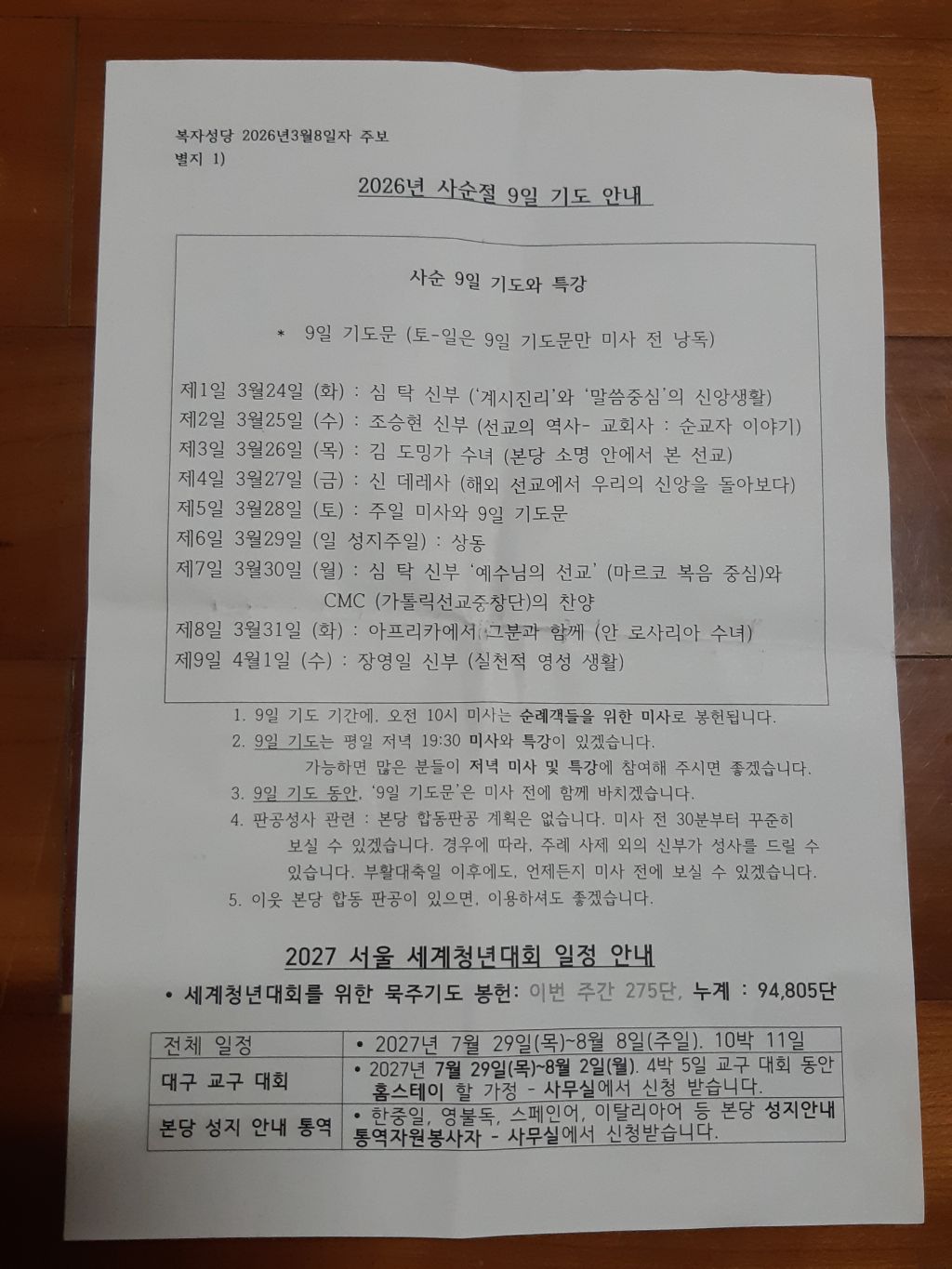 2026년 사순절 9일 기도 안내 작성자엠마누엘라|작성시간26.03.09|조회수93 목록 댓글 0 글자크기 작게가 글자크기 크게가 사순 9일 기도와 특강. 그리고 2027 서울 세계청년대회 일정 안내(복자성당 2026년 3월8일자 별지 1) 다음검색 현재 게시글 추가 기능 열기 북마크 공유하기 신고 센터로 신고 댓글 댓글 0 댓글쓰기 답글쓰기 댓글 리스트