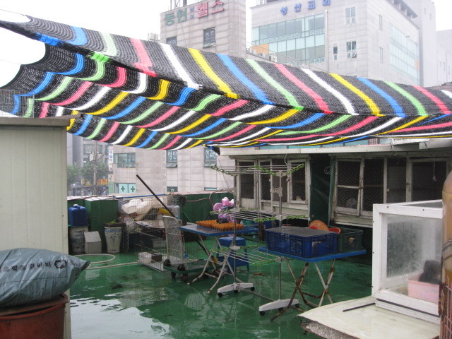 어제 비가 잠시 그친 사이 굵은 반생이로 닭장 지붕과 옥탑 펜스를 연해 팽팽하게 당겨 줄을 연결 하고 그 위에