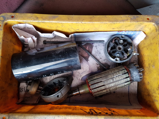 분해를 해보니 부식으로 절연에 문제가 있었으며 브러쉬홀더의 브러쉬도 깨져 있었으며 스프링도 부식으로 작동이 안되었습니다. 피니언기어를 밀어주는 스프링이 문제가 있었고 아마추어의 정류자 부위에 부식이 있었읍니다.
