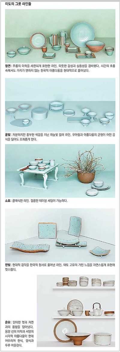이도의 제품은 겉으로는 투박해 보이지만 이 대표가 치밀한 계산을 통해 디자인한 작품들이다. 2011년 미국 공영방송 PBS에서 내놓은 ‘김치 크로니클스’라는 책에 음식을 담는 그릇으로 쓰이며 미적 가치를 인정받았다. 백화점에 입점하기 전에는 삼성 일가 결혼식에 이바지 그릇으로 쓰이기도 했다.