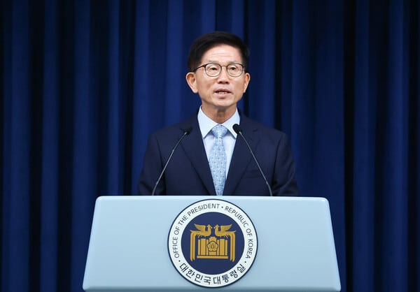 31일 고용노동부 장관 후보자로 지명된 김문수(왼쪽) 경제사회노동위원장이 정진석 대통령 비서실장과 함께 서울 용산 대통령실 청사 브리핑룸에 입장하고 있다. /뉴스1