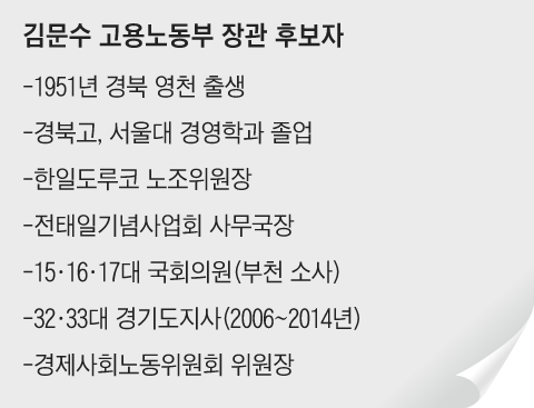 김 후보자는 경북고를 졸업하고 1970년 서울대 경영학과에 입학했다. 대학 재학 시절 학생운동을 하다가 1974년 전국민주청년학생총연맹(민청학련) 사건으로 제적됐고, 이후 노동운동에 뛰어들었다. 서울 청계천 피복 공장에서 재단 보조공이 첫 직업이었다. 이후 한일도루코 노조위원장, 전태일기념사업회 사무국장 등을 지내는 등 노동운동계 중심에 섰다.