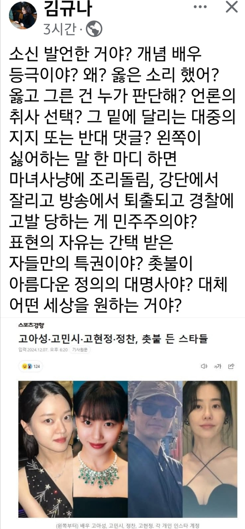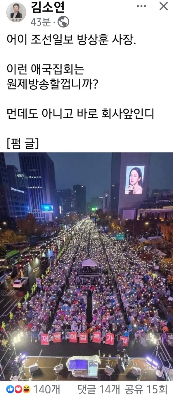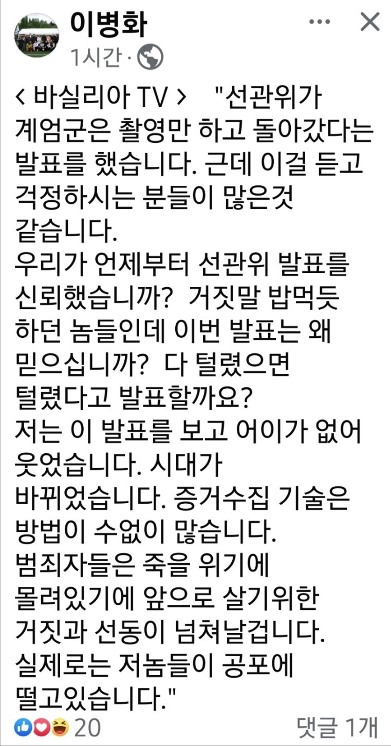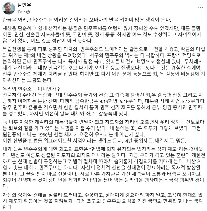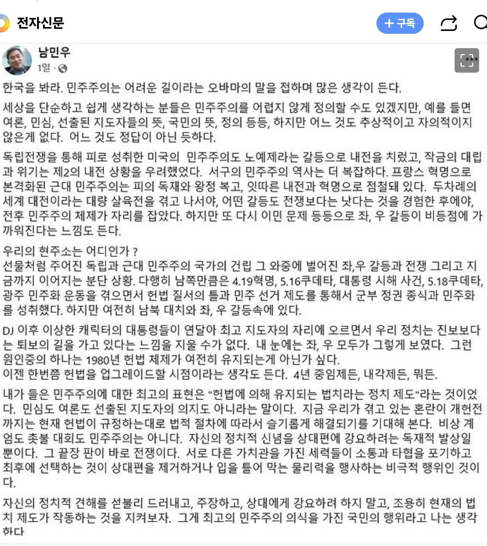 그러면서 그는 “자신의 정치적 견해를 섣불리 드러내고, 주장하고, 상대에게 강요하려 하지 말고, 조용히 현재의 법치 제도가 작동하는 것을 지켜보자. 그게 최고의 민주주의 의식을 가진 국민의 행위라고 나는 생각한다”고 글을 마무리했다.