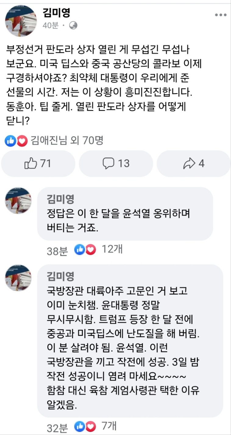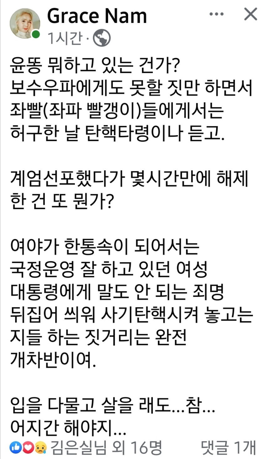 현재 한국은 12.3 비상계엄으로 다소 혼란을 겪고 있습니다. 그러나 이러한 윤석열대통령의 결행은 그동안 자행된 야당의 비도적이고 반국가적 행태를 오랫동안 지켜본 입장에서 충분히 납득가능한 일이라고 하겠습니다.