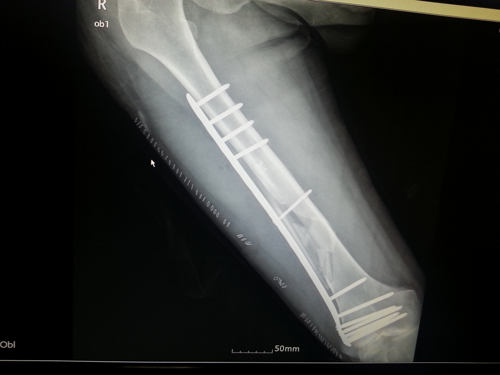 2013년 4월에 대퇴골 골절로 금속판 고정술을 받았습니다