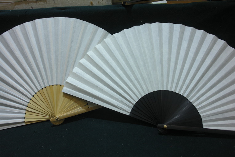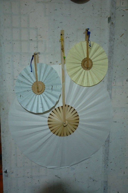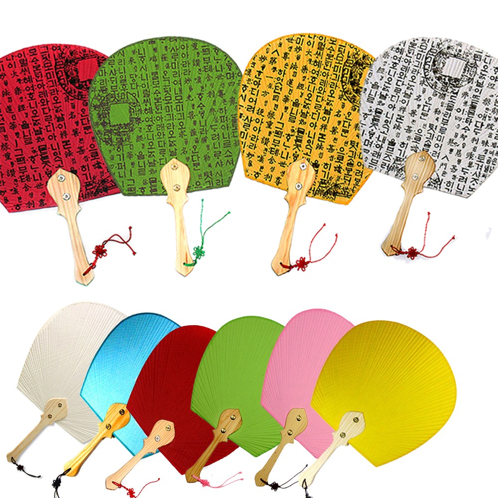 한지 부채 : 가는 대오리를 살로 하고 종이를 둥글게 잘라 풀을 발라서 자루를 붙여서 만든다