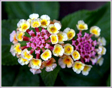 00288 ▲ 란타나 : 통화식물목 마편초과의 상록관목.열대·아열대아메리카가 원산지이다. 잎은 마주나며 달걀꼴로 길이 2∼9㎝이며,가장자리에 톱니가 있다. 잎겨드랑이에서 지름 7∼8㎜의 작은 꽃이 모여 피어삿갓 모양을 이룬다. 꽃술 중심부터 개화하며, 꽃색은 처음에는노랑 또는 담홍색이나 차츰 귤색 또는 진한 빨강색으로 바뀐다.