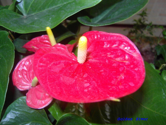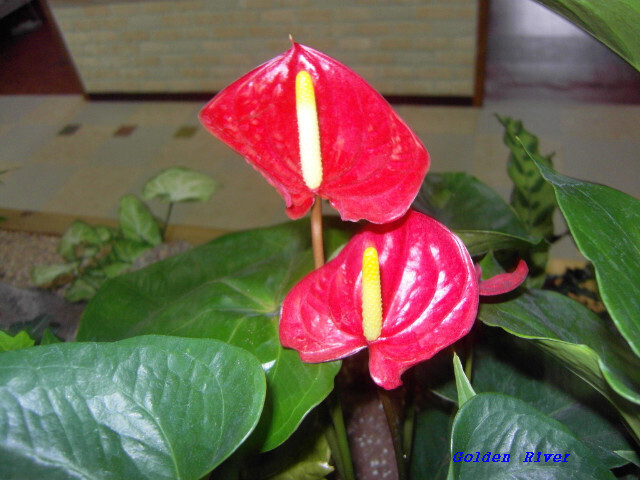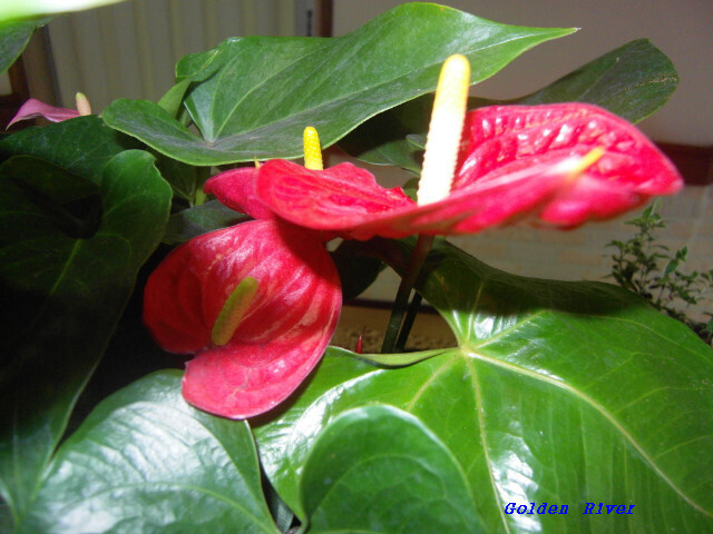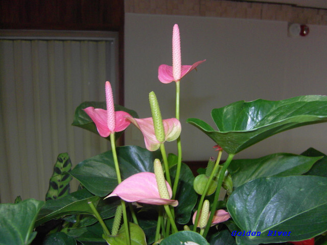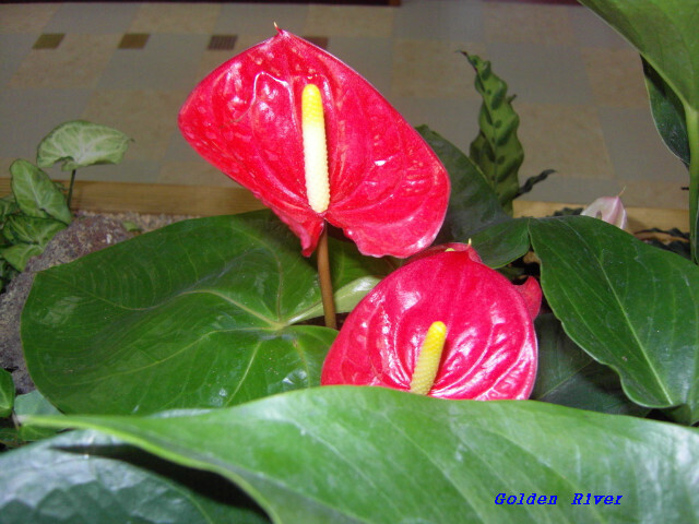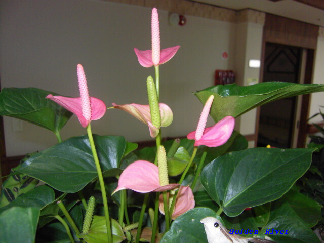 홍학꽃(A.andraeanum)은 키가 60㎝에 이르는 줄기를 가지는데,불염포가 연어살빛이 나는 붉은색이고 심장 모양이며 길이가 5~8㎝ 정도이다.이 종의 잡종들은 흰색, 연어살색, 붉은색, 진한 붉은색의 불염포를 가진다.플라밍고안투리움(A. scherzeranum)은 키가 좀더 작고 주홍색의 불염포와느슨하게 꼬인 오렌지빛 붉은색의 육수꽃차례가 달린다. 이 종의 한 변종은불염포의 길이가 13㎝ 정도이고 붉은색 바탕의 불염포에 흰 점이 찍힌 변종도 있다. 이 속의 식물은 따뜻한 기온과 높은 습도를 요구하여, 보통 온실에서 기른다.