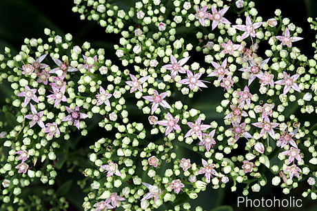 취산꽃차례는 원줄기 끝에 달리고 빽빽이 모여 있어 산방상으로 보인다.꽃받침조각과 꽃잎은 5개씩이고 꽃잎은 끝에 톱니가 있으며 밑부분에 털이 있다.꽃잎은 겹으로 된 것도 있다. 수술은 10개이며 암술대는 2개로 갈라진다.