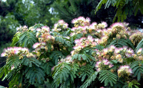 00284 ▲ 자귀나무 꽃 : 장미목 콩과에 속하는 낙엽교목.높이 6∼9m. 잎은 2회깃꼴겹잎이고 길이 20∼30㎝이며 잎자루가 있고, 5∼12쌍의 깃조각이 마주난다. 잎은 수면운동으로 인하여 밤에는 축 늘어진다.6∼7월에 가지 끝에 십수 개의 두상(頭狀)꽃차례가 송이모양으로 달린다.저녁 때 동시에 피며 분홍색의 긴 수술이 여러 개 우산모양으로 펼쳐진다.