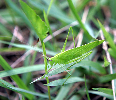 00248 ▲ 베짱이 : 몸길이 30∼36mm이다. 몸빛깔은 대개 녹색이다. 몸은 굵고 두꺼운 편이다. 머리의 정수리돌기는 옆으로 넓적하다.머리와 등가슴, 가운뎃가슴 배면은 짙은 갈색이고 그 테두리는 노란색이다.앞가슴은 둥근 안장 모양이고, 중앙은 연한 갈색이며 뒤쪽이 넓다.
