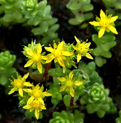 00281 ▲ 땅채송화 : 장미목 돌나물과의 여러해살이풀. 지표를 기어뻗어가는줄기에서 다수가 직립하거나 비스듬히 위로 뻗어 빽빽히 난다. 잎은 어긋나고 빽빽히 붙어 있으며 길이 3∼7㎜의 쌀알 모양이다. 5∼7월에 가지 앞쪽 끝에 3∼10개의 꽃이 집산꽃차례로 달린다.꽃은 5수성의 방사대칭이며 지름 1㎝ 정도이다.