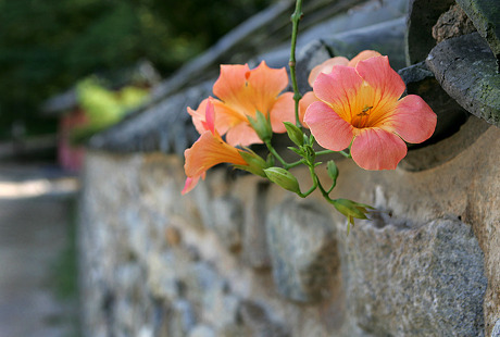삭과는 2개로 갈라지며 10월에 익는다. 원산지는 중국으로 중부이남의 사찰에서 심어 왔으며 관상용으로도 많이 재배되고 있다.기와담장에 기대어 피어난 예쁜 색깔의 능소화가 지난 여름을 추억하게 합니다.