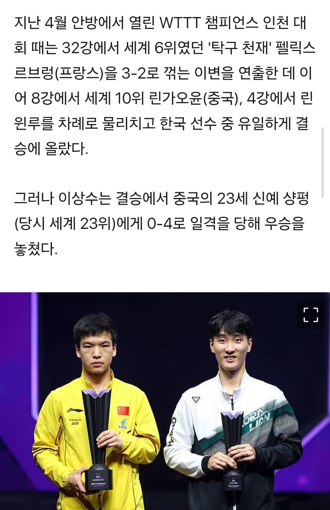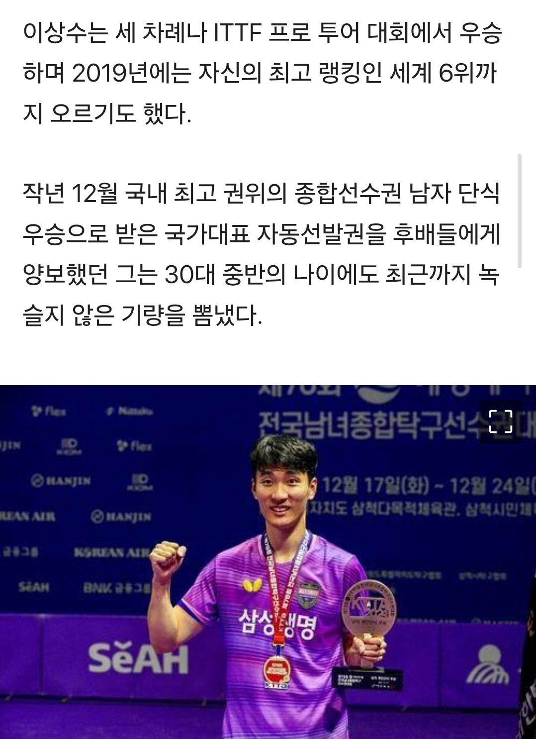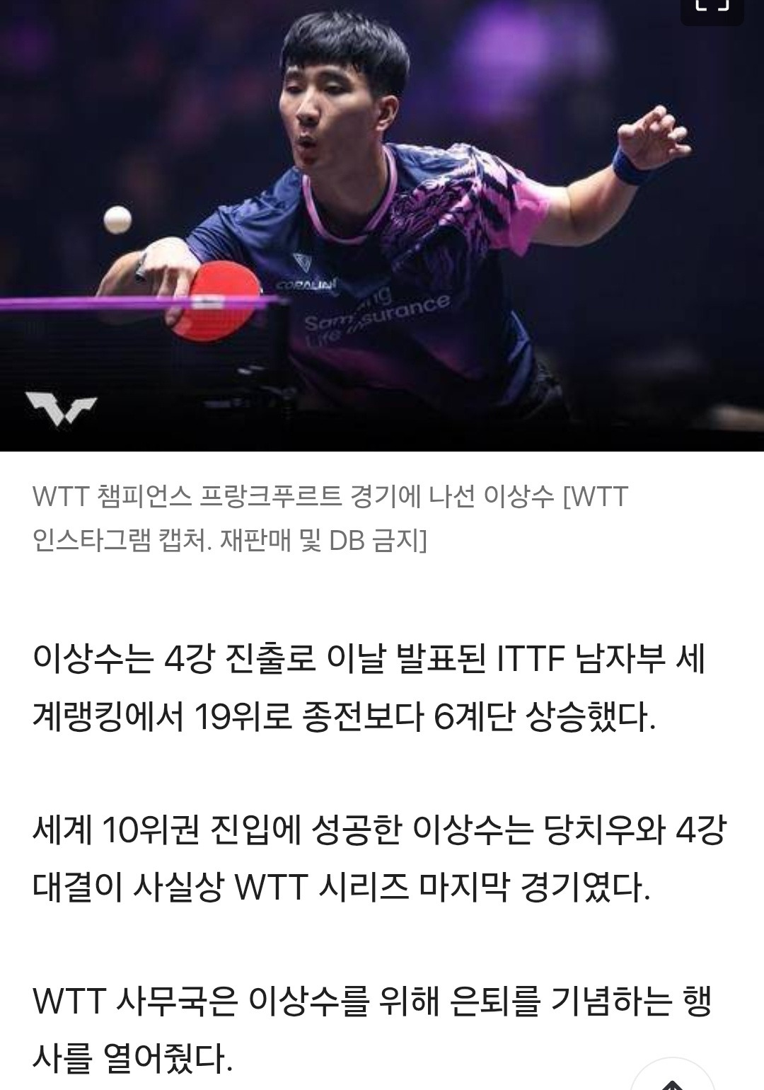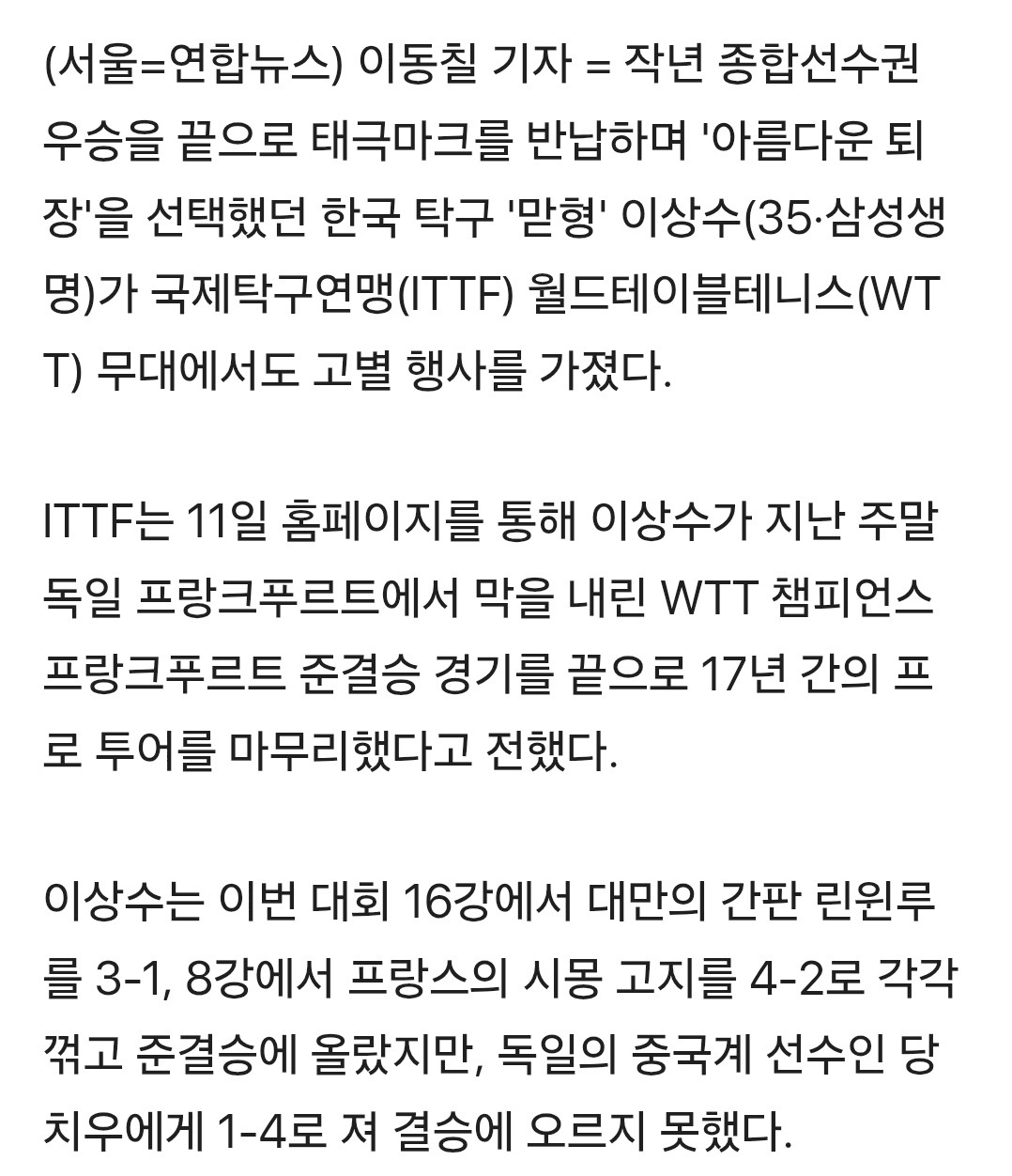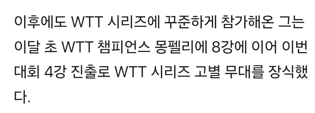 한국 탁구 '맏형' 이상수, 챔피언스 독일 대회서 WTT 무대 은퇴 작성자이영임|작성시간25.11.12|조회수181 목록 댓글 0 글자크기 작게가 글자크기 크게가 다음검색 현재 게시글 추가 기능 열기 북마크 공유하기 신고 센터로 신고 댓글 댓글 0 댓글쓰기 답글쓰기 댓글 리스트