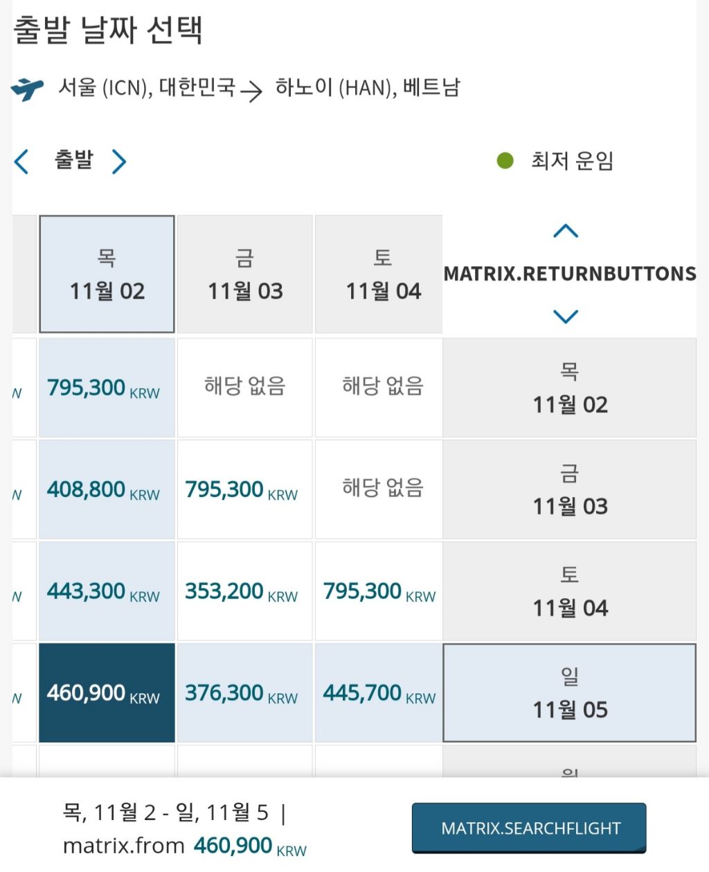 11월 2일 인천출발하여 5일 오후에 귀국하는 베트남항공권은 왕복료가 460.900원입니다.