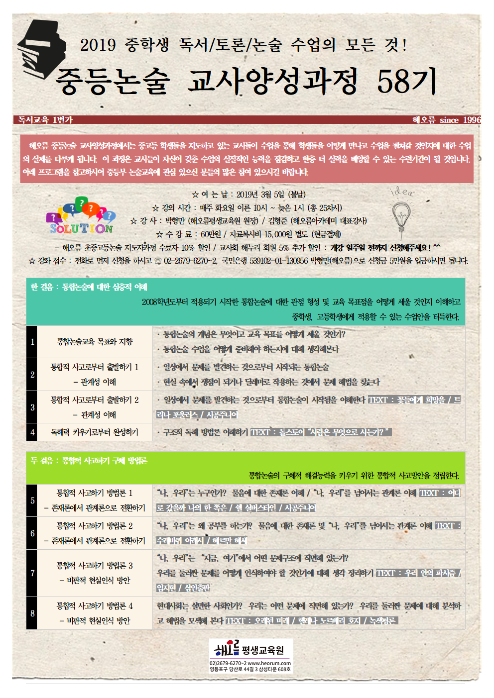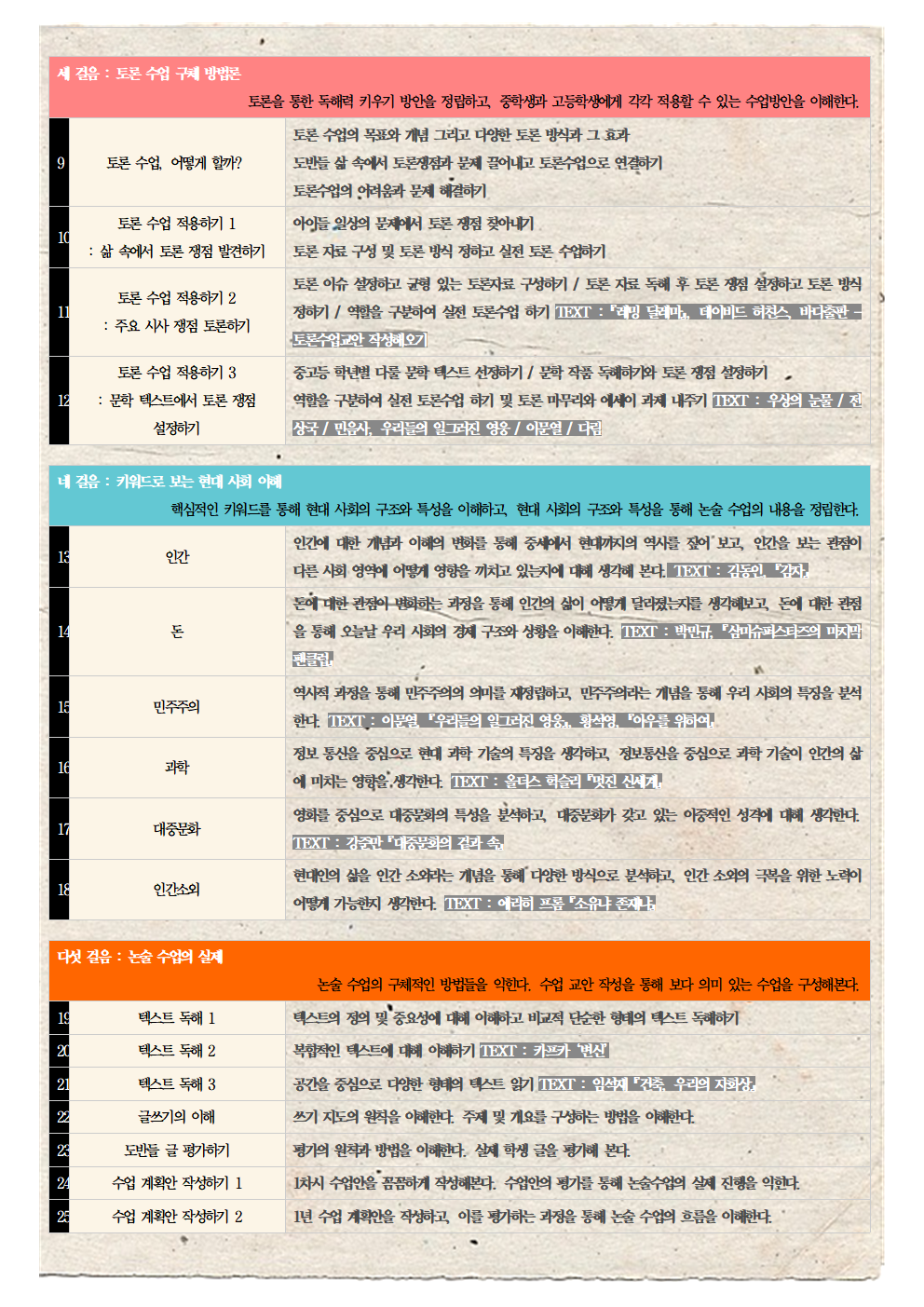 독서는 모든 교육의 시작입니다. 중학교 시기의 아이들에게 어떤 주제의 교육이 필요한지, 그 방법은 무엇인지, 책을 통해 어떻게 말을 걸고, 마음을 나눌 수 있는지 알고 싶어하시는 모든 분들께 이 과정은 자신이 갖춘 실질적인 능력을 점검하고 한층 더 실력을 배양할 수 있는 수련기간이 될 것입니다. 아래 프로그램을 참고하시고, 많은 분들의 관심과 참여 부탁드립니다.