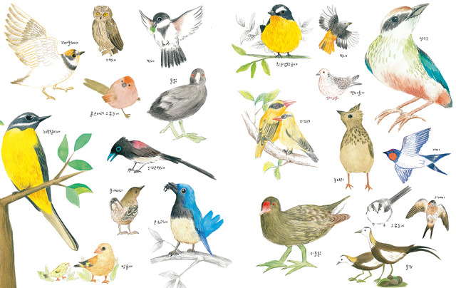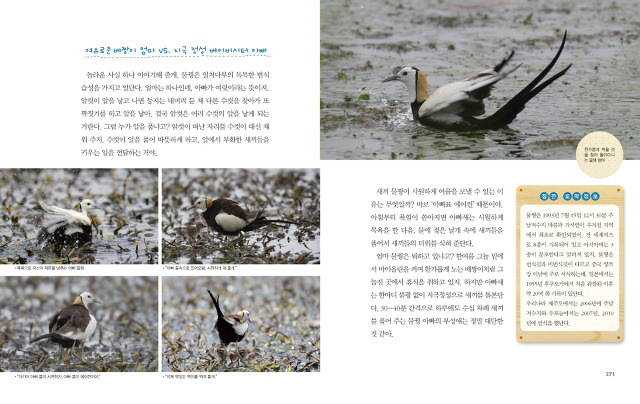 사랑의 짝짓기를 하는 멧비둘기, 알에서 깨어나 먹이를 기다리는 박새, 새끼에게 해바라기 씨를 먹이는 방울새, 주변을 경계하며 알을 보호하는 꼬마물떼새, 한입 가득 물고 온 먹이를 새끼에게 먹이는 오목눈이, 12월에 을숙도에서 겨울을 나고 있는 제비, 깃털을 손질하는 물까마귀, 입을 크게 벌리며 먹이를 달라고 재촉하는 종다리, 뽕나무 열매를 먹이려는 큰유리새, 쇠제비갈매기의 프러포즈 장면, 알에서 갓 부화한 새끼 물닭, 배설물을 처리하는 때까치, 새끼 뻐꾸기에게 먹이를 먹이는 붉은머리오목눈이, 부드러운 수초를 새끼에게 먹이는 쇠물닭, 능청스러운 연기로 침입자를 희롱하는 흰물떼새, 화려하게 짝짓기를 하는 물꿩 모습…. 이야기에 생동감을 불어넣는 아름답고 살아 숨쉬는 300여 컷의 사진이 글이 지나가는 길목에 자리 잡고 있어 독자들의 눈을 즐겁게 한다.