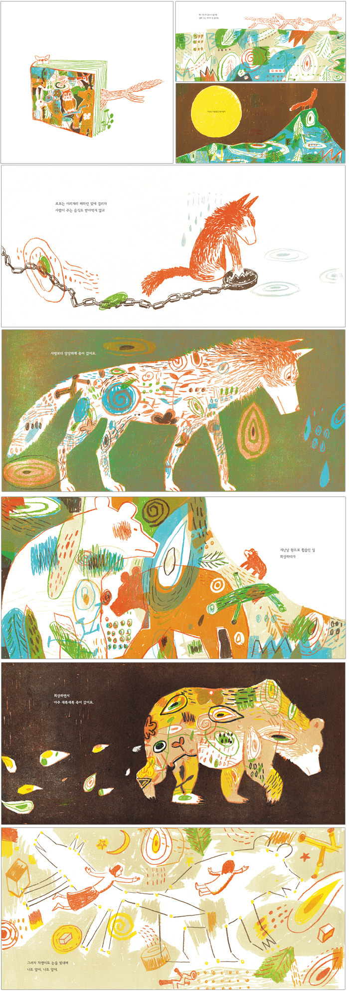 이런 감각을 시인은 “사람 보다 당당하게 죽어갔어요”, “아주 새록새록 죽어갔어요” 같은 시구로 표현합니다. 아이의 눈에 비춰진 로보와 와프의 죽음은 두렵고 어두운 이미지가 아니라 삶의 과정 속에 있는 자연스러운 이미지이지요.